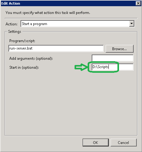 I got error (0x1). Then I googled and found this article. Basically you have to enter the path to your script in a different input field. Windows’ Browse button is miss-leading: